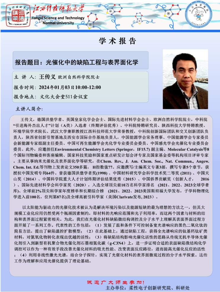 1月3日上午10:00,陕西科技大学王传义教授进行了题为《光催化的缺陷工程与表界面化学》的学术讲座,本次会议由江西科技师范大学柔性电子江西省重点实验室主任卢宝阳主持。