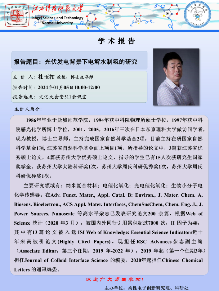 1月5日上午10:00,苏州大学杜玉扣教授进行了题为《光伏发电背景下的电解水制氢的研究》的学术讲座。本次会议由江西科技师范大学柔性电子创新研究院周卫强教授主持。