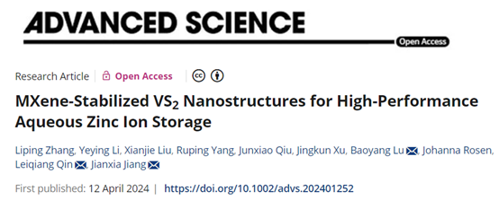 Liping Zhang, Yeying Li, Xianjie Liu, Ruping Yang, Junxiao Qiu, Jingkun Xu, Baoyang Lu*, Johanna Rosen, Leiqiang Qin*, Jianxia Jiang*, MXene-Stabilized VS2 Nanostructures for High-Performance Aqueous Zinc Ion Storage, Advance Science, 2024, 2401252.