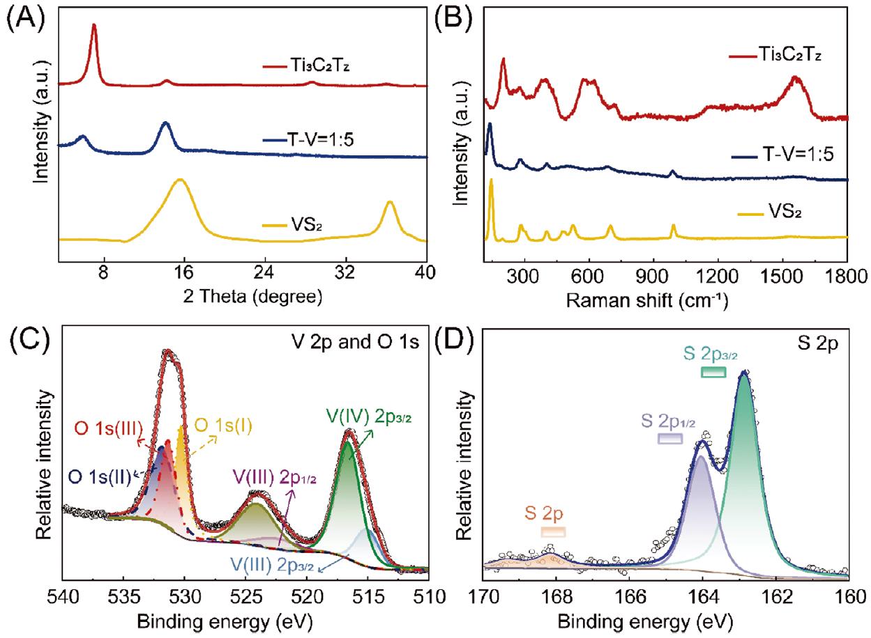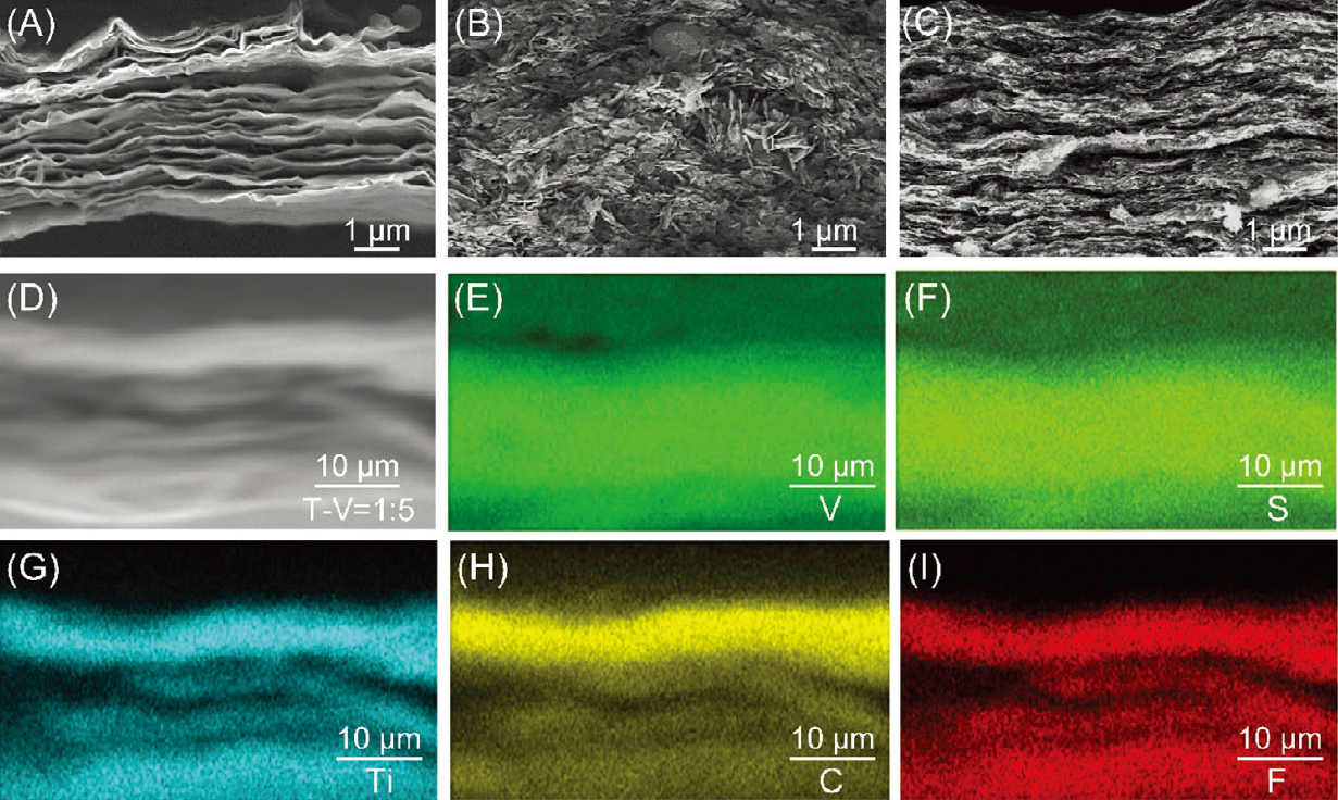 通过SEM、EDS、XRD以及XPS等技术对复合膜材料进行了形貌与结构的表征。结果显示 Ti3C2TZ 为有序堆叠的层状结构而 VS2 纳米片呈无规则堆叠状态,这导致了 VS2 差的成膜性和机械稳定性。而通过纳米结构复合工程,将 VS2 有序的嵌入到了MXene 的层间,与MXene 交替排列,改变了原始 VS2 无序的堆积状态,显示出清晰的异质层状结构。EDS 表明了复合膜内 VS2 与 Ti3C2TZ 的均匀分布状态(图3)。