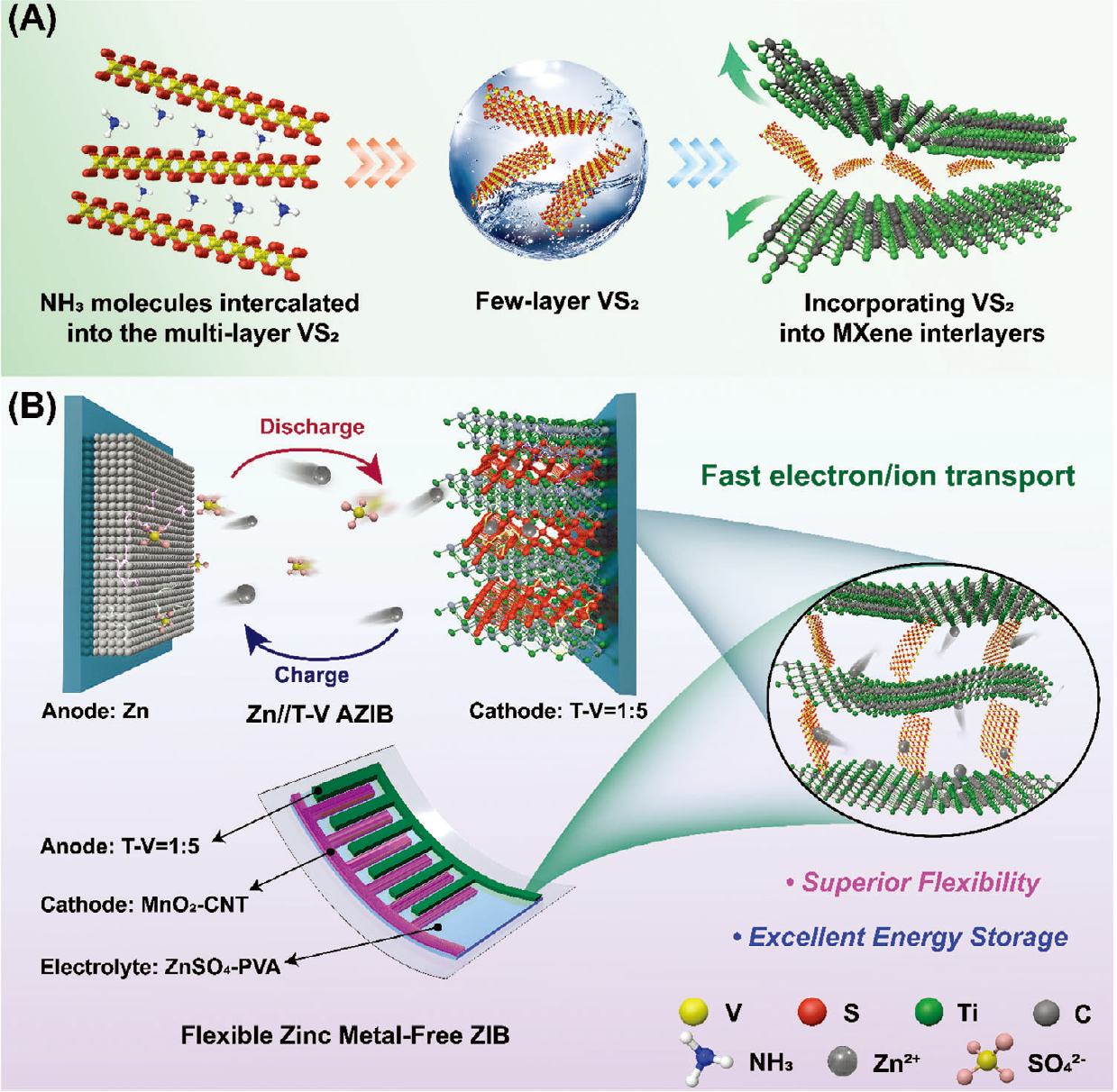 采用纳米结构复合工程技术来构建兼具高电导率和高稳定性的 VS2 基异质结构是提高 VS2 电化学性能的有效策略。实验通过经典的 MILD 法刻蚀制备了 Ti3C2TZ 胶体溶液,并通过优化合成方法(结合氨辅助水热法与超声剥离法),调整材料的堆叠方式,成功地制备了单层或少层的超薄 VS2 纳米结构材料,后利用纳米复合工程技术调控 VS2 纳米片在MXene层间的嵌入,形成柔性自支撑复合膜电极。利用 VS2/Ti3C2TZ 复合薄膜的三维开放骨架,可以实现电化学反应过程中 Zn2+ 和SO42- 在电极上的高效可逆吸脱附(图1 所示)。