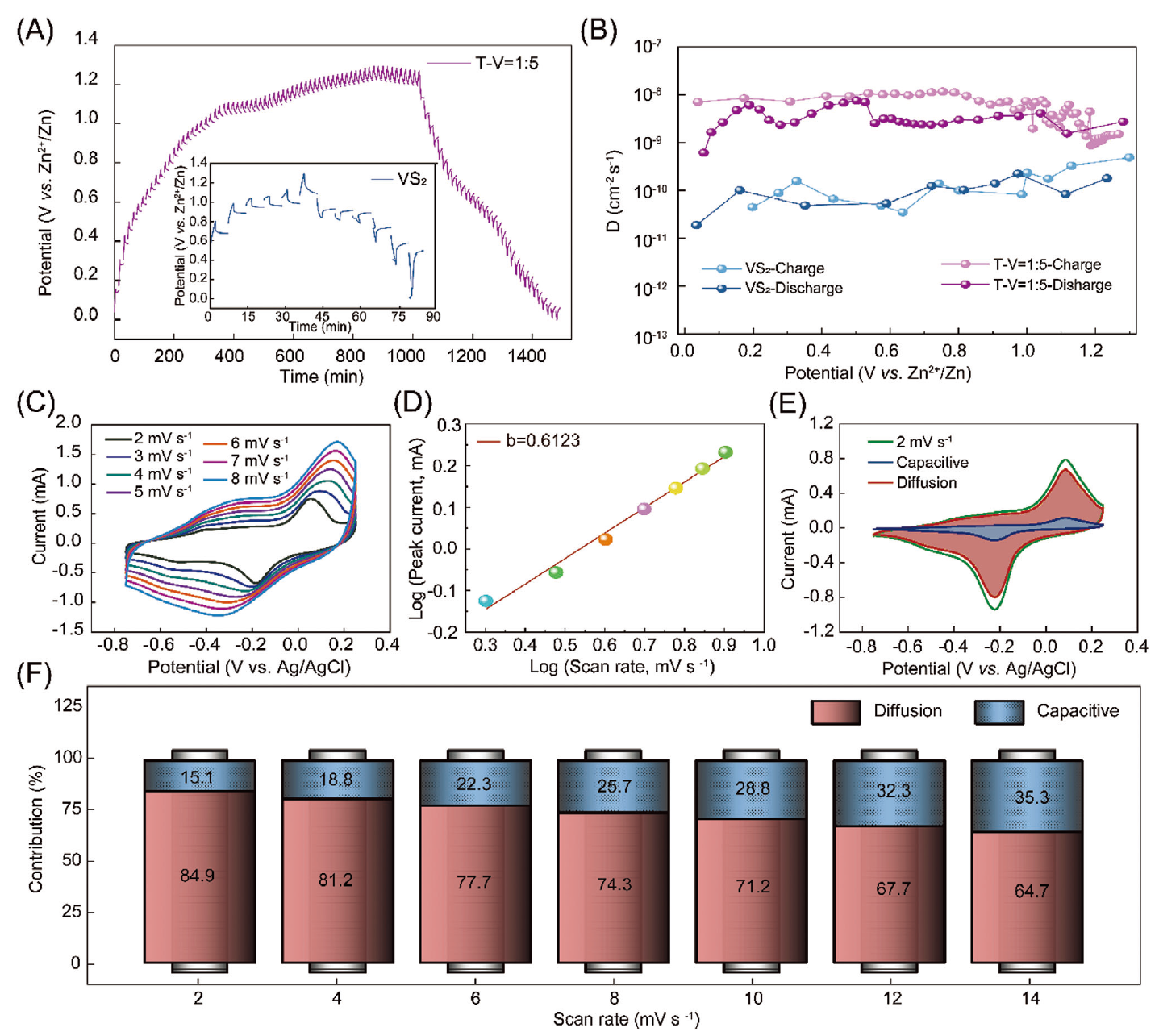 这种高 Zn2+ 扩散系数与电极的异质结构密切相关。Ti3C2TZ 提供了快速电子传输的导电骨架,而 VS2 的纳米结构则提供了大的比表面积和活性位点。通过对 T-V=1:5 复合材料电荷存储机制的分析,发现 T-V=1:5 的 Zn2+ 存储过程是由离子扩散和电容特性之间的协同作用控制的。在这一过程中,扩散控制行为占主导,并且随着扫描速率的增加,电容的贡献率逐渐增加。