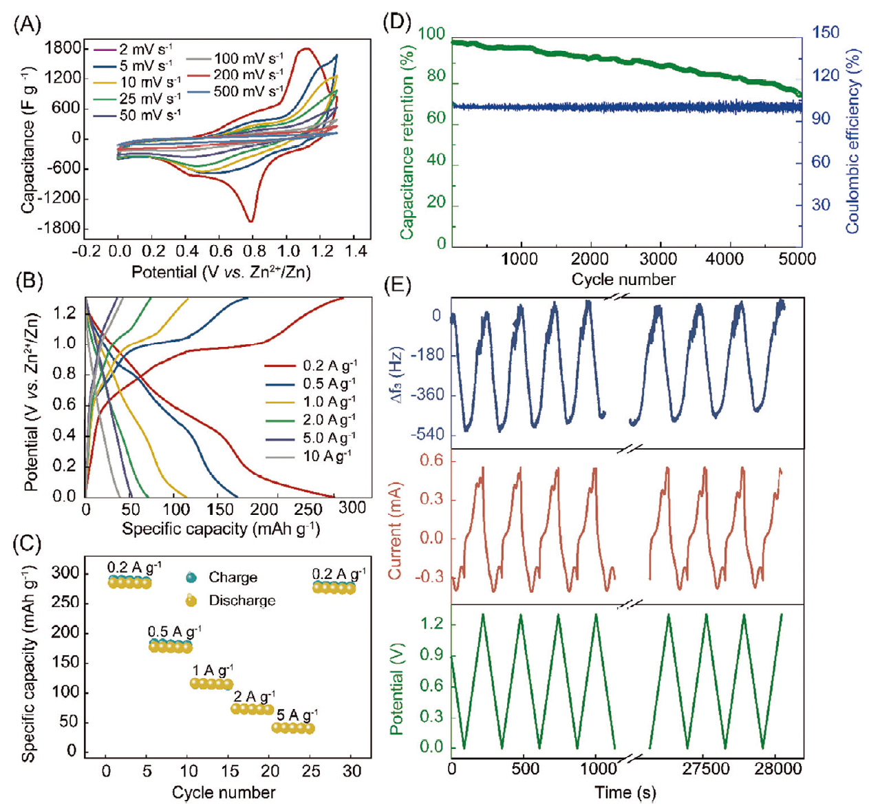 ⭐性能提升:柔性 VS2/Ti3C2TZ 复合膜可以在不同结构的锌离子电池中同时充当正极和负极。作为 AZIBs 的正极,复合膜在 0.2 A g-1 可实现 285 mAh g-1 的高容量。作为无锌金属的叉指型平面柔性ZIB的负极,柔性无锌金属 ZIBs 实现了高达2.0 V的工作电位窗口,这几乎是迄今为止报道的 MXene 基 ZIBs 的最宽电压窗口(最宽电压窗口为2.4 V)。5000次循环后的电容保持率可达96.7%。该工作为开发低成本、高稳定性和安全性的水系电池提供了新的思路,有利于促进ZIB的进一步发展。