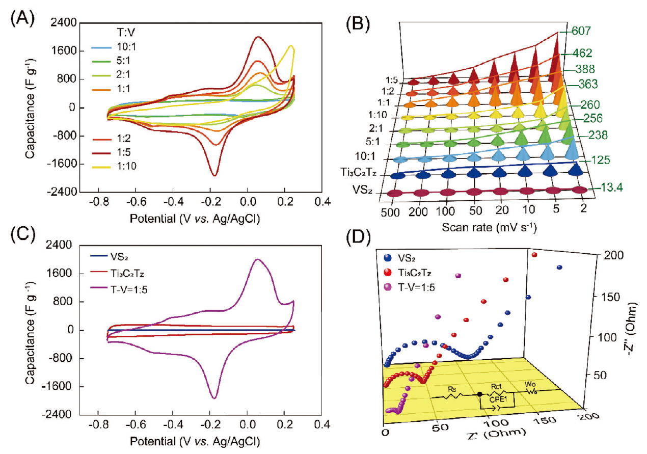 实验采用三电极体系探究并优化了 VS2 与 MXene 的复合比例。结果表明,质量比为 Ti3C2TZ:VS2=1:5 (标记为 T-V=1:5) 的复合膜电极表现出高达607 F g−1 的比电容(图2),引入 MXene 不仅提高了 VS2 的导电性和成膜性,还有效地改善了复合膜的电子和离子传输性能。