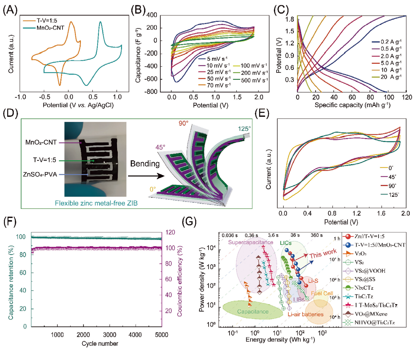 为了进一步探究拓宽复合膜材料在锌离子电池中的应用。我们以 T-V=1:5 的复合膜材料作为负极,MnO2-CNT 为正极,ZnSO4-PVA 为凝胶电解质制备了一种不含锌金属的叉指型平面柔性ZIB(图8)。结果显示,柔性无锌金属 ZIBs 实现了高达2.0 V的工作电位窗口,这几乎是迄今为止报道的MXene基ZIBs的最宽电压窗口(最宽电压窗口为2.4 V)。在0.2 A g−1 的电流密度下,柔性无锌金属ZIBs的初始容量为98.2 mAh g−1。同时准固态无锌金属的叉指型平面ZIB显示出优异的柔性,在不同的弯曲条件下几乎无容量衰减,并且显示出优异的长期循环寿命(在2 A g-1下5000次循环后的容量保持率为96.7%),在能量密度93.2~25.4 Wh kg-1 下,功率密度可达190-9500 W kg-1,因此,有望拓宽 ZIBs 在柔性可穿戴储能设备中的发展与应用。