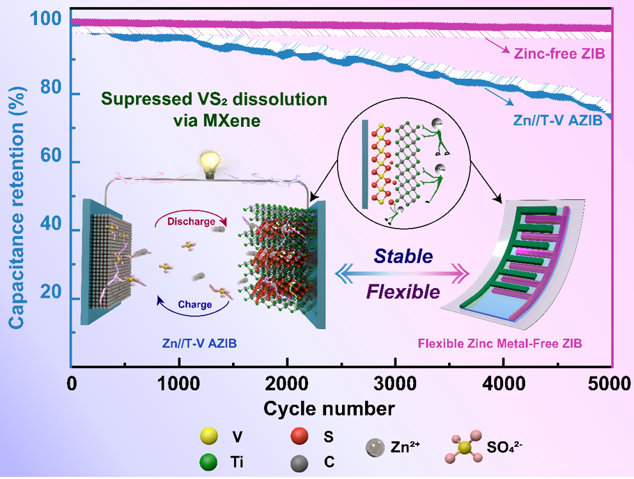 江西科技师范大蒋剑霞副教授、卢宝阳教授以及瑞典林雪平大学秦磊强等人采用纳米复合结构工程成功制备出了一种柔性自支撑 VS2/MXene 复合膜电极材料用于高性能水系锌离子储能器件。团队利用 MXene 优异的电导性和高比表面积,使其作为活性材料的导电骨架,有效地将 VS2 的引入到MXene层间以构建稳定的2D异质分层结构。研究发现,MXene 与 VS2 纳米片之间存在稳定的相互作用,这种相互作用有效地增强了电化学过程中VS2纳米片的结构稳定性,进而提高了它们在ZIBs中的循环寿命。该工作以张丽萍为第一作者发表在国际顶级期刊Advanced Science上。