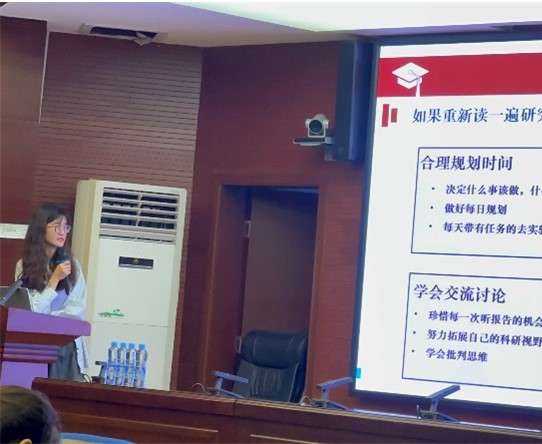 随后,2024届优秀毕业生曹杰和徐新叶分享了他们在读研过程中的宝贵经验,为在场的同学们带来了激励和信心,新生们也积极上台自我介绍,展现出青春活力。