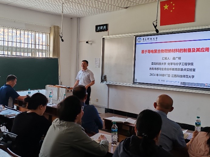 会议伊始,卢宝阳教授热情欢迎聂广明教授的到来,并对聂教授的卓越学术成就进行了深入介绍。聂广明教授随即带来了一场题为《基于导电聚合物微纳米材料的制备及其应用》的学术报告。他生动地讲解了导电聚合物的研究背景、其在储能器件中的应用,以及功能基团修饰如何提升电致变色和储能性能。他还分享了导电聚合物微纳米材料在生物和气体传感器中的应用实例,将他近年来的科研心得娓娓道来,引人入胜。报告结束后,徐景坤教授发表了深情致辞,特别强调了研究思维的重要性,并对实验室未来的发展寄予了殷切期望。
