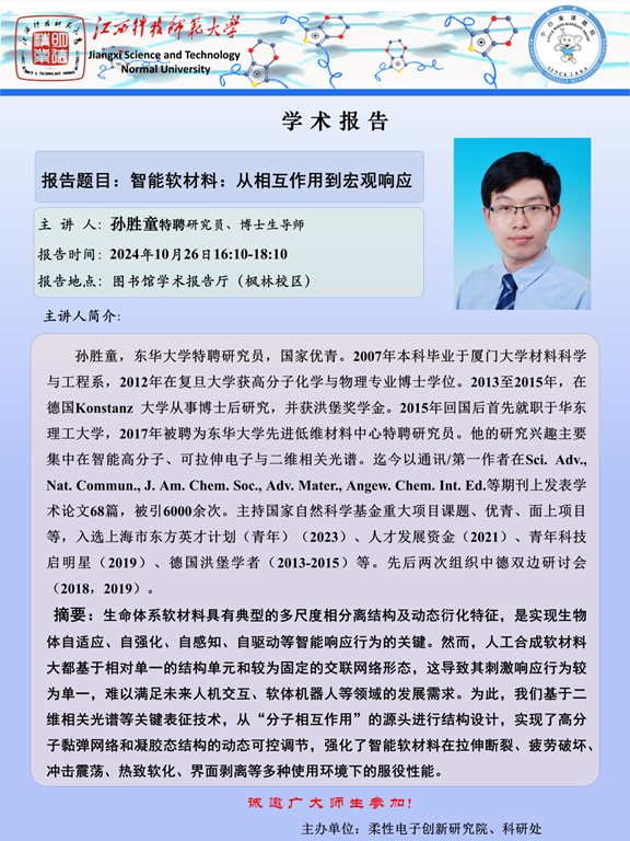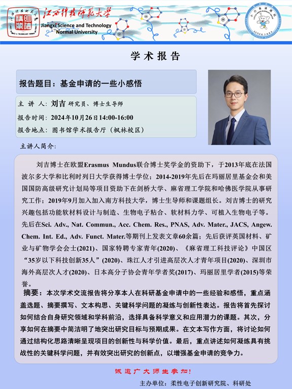 2024年10月26日下午两点,柔性电子江西省重点实验室举办了一场学术讲座,特邀南方科技大学刘吉研究员(国家青年千人)和东华大学特聘研究员孙胜童(国家优青)分别作《基金申请的一些小感悟》和《智能软材料:从相互作用到宏观响应》的主题报告。讲座由柔性电子江西省重点实验室主任卢宝阳教授主持,吸引了化学化工学院、药学院、生命科学学院等多个学院的教授、讲师及研究生积极参与。