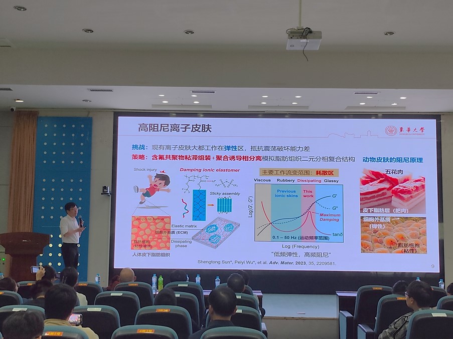孙胜童研究员则围绕生命体系中的智能软材料,剖析了其多尺度相分离结构及动态特性的关键作用。首先强调了生命体系软材料具有典型的多尺度相分离结构及动态衍化特征,是实现生物体自适应、自强化、自感知、自驱动等智能响应行为的关键。接着分享了他们目前的研究成果,从“分子相互作用”的源头进行结构设计,实现了高分子黏弹网络和凝胶态结构的动态可控调节,强化智能软材料在拉伸断裂、疲劳破坏、冲击震荡、热致软化、界面剥离等多种使用环境下的服役性能,并为参会者们生动地展示了这些材料的实际应用视频,极大的激发了师生们的兴趣。