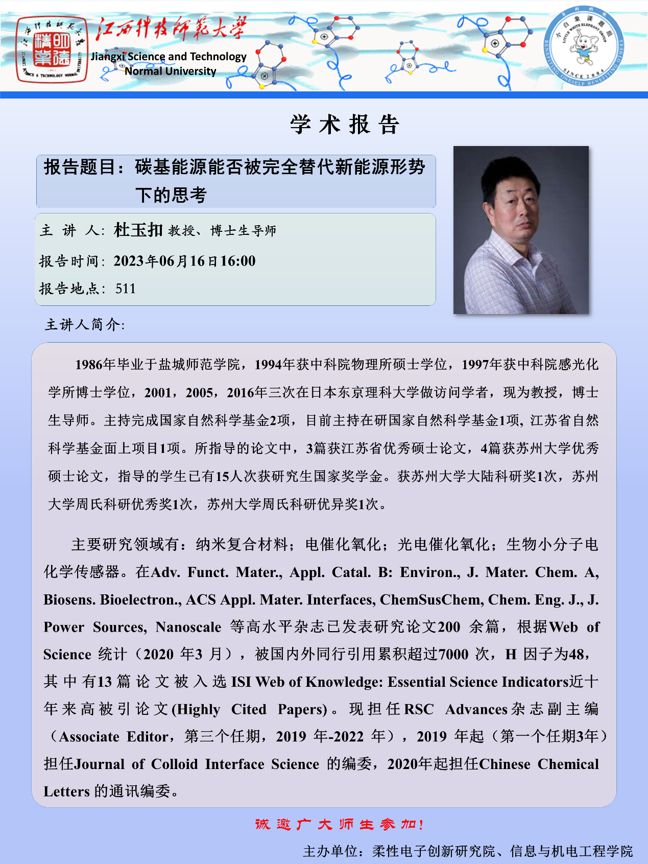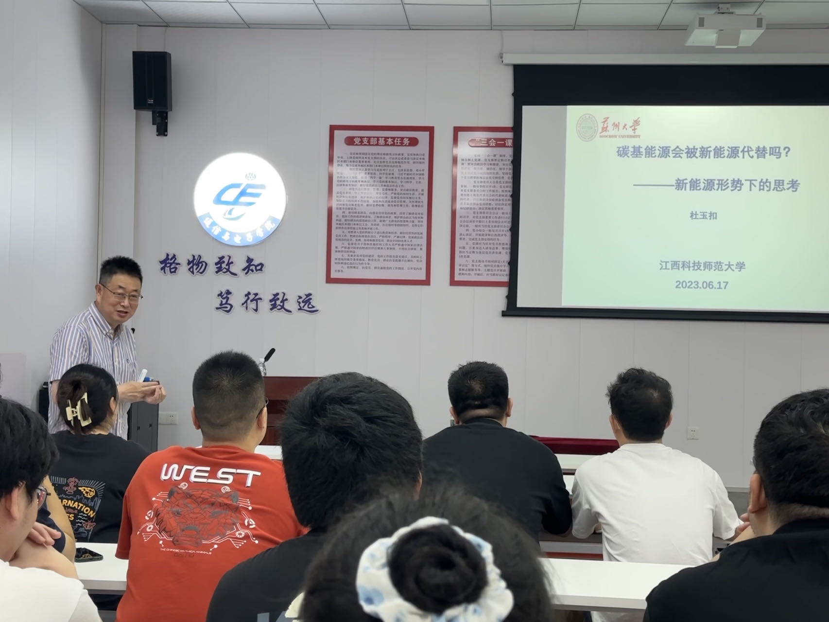 6月16日下午,苏州大学杜玉扣教授,在511会议室举办了题为《碳基能源能否被完全替代新能源形势下的思考》的学术讲座。