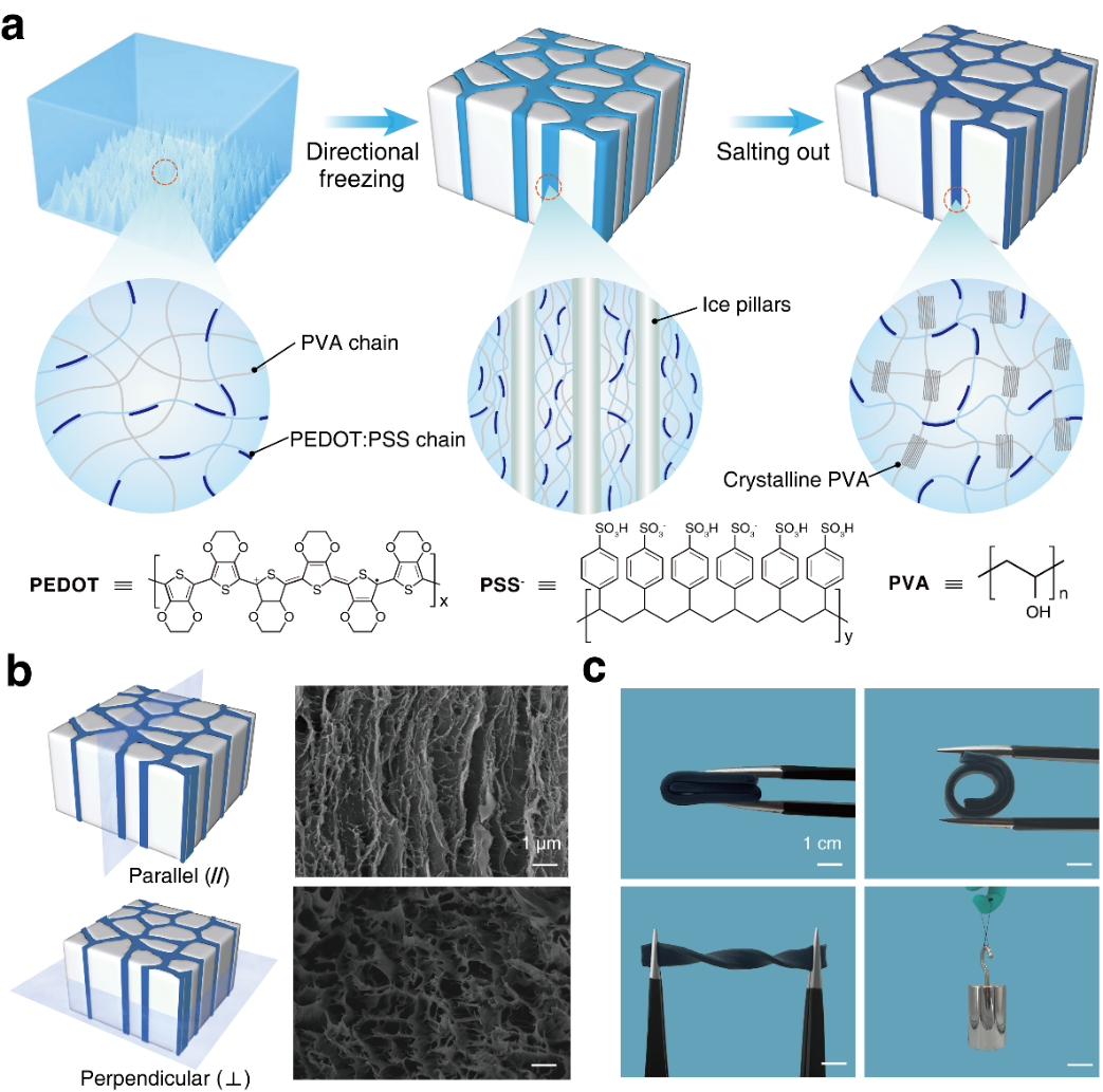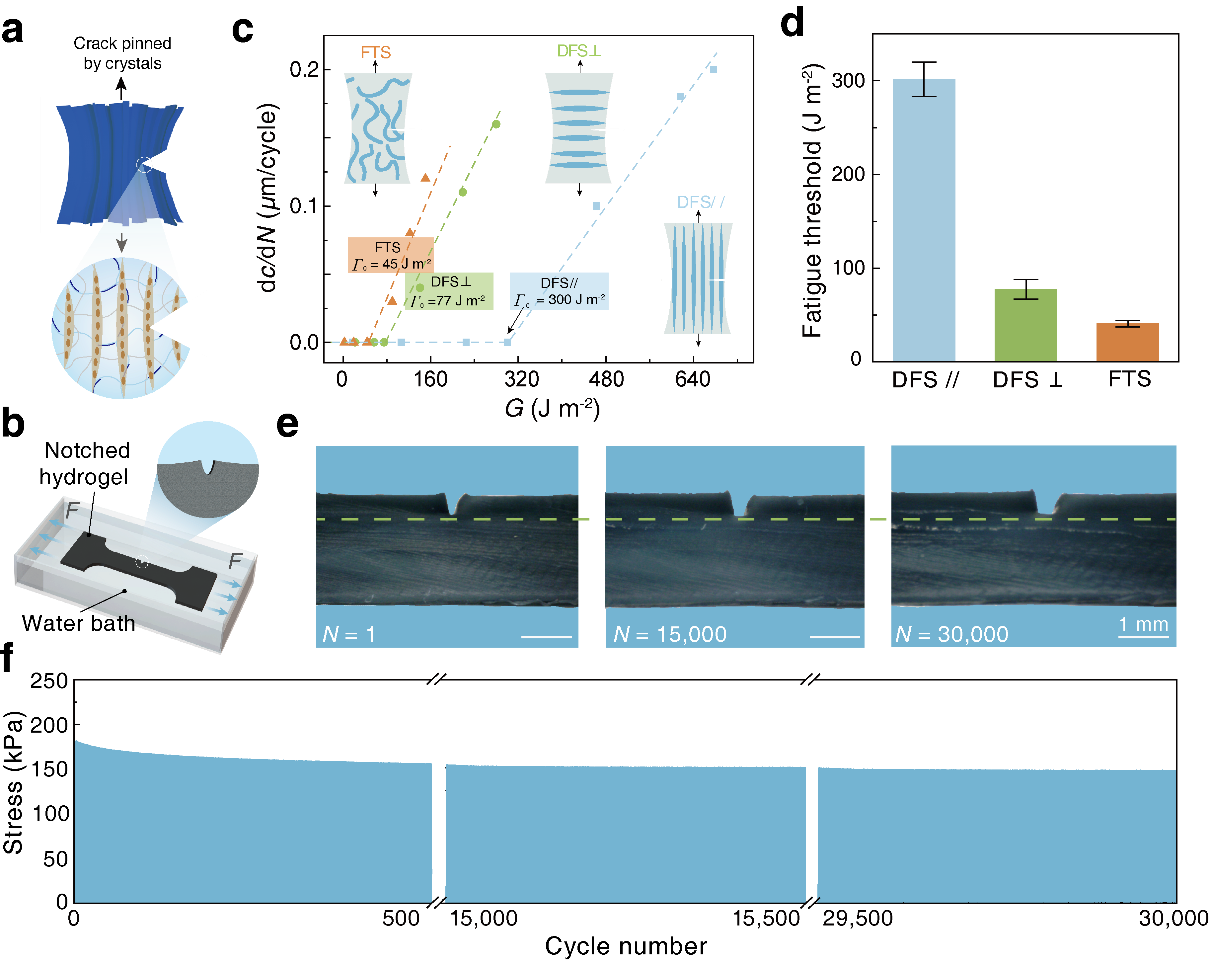 团队选用聚乙烯醇(PVA)和商业化导电聚合物PEDOT:PSS作为制备导电聚合物水凝胶的材料,通过定向冷冻辅助盐析策略(DFS)制备有序排列的各向异性抗疲劳PEDOT:PSS-PVA导电聚合物水凝胶(图1)。将聚合物组分转移到特制的模具中进行单向定向冷冻处理,使聚合物组分形成有序排列的各向异性结构,然而低结晶度导致单向定向冷冻水凝胶力学性能较差。进一步将PEDOT:PSS-PVA水凝胶浸入到柠檬酸钠溶液中,利用霍夫迈斯特效应诱导PVA网络的相分离和结晶,从而使水凝胶增韧。由于其独特的有序纳米纤维结构和高结晶度,DFS PEDOT:PSS-PVA导电聚合物水凝胶能够承受各种形式的机械变形和负载(超过自身重量10,000倍),并且在平行取向上的疲劳阈值能够达到300 J m-2以上(图2)。在30,000次连续循环拉伸过程中,裂纹依然没有拓展,表现出优异的抗疲劳特性。