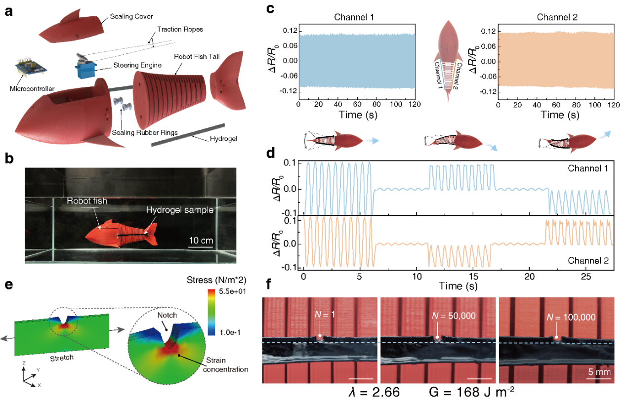 团队进一步将DFS PEDOT:PSS-PVA水凝胶应变传感器集成到水下机器鱼侧部作为关键承载元件和运动监测传感器(图4),在机器鱼游泳过程中,水凝胶经历周期性的拉伸和收缩(能量释放率为168 J m-2),在游泳16小时后,超过100,000次循环后没有检测到任何裂纹扩展,证实了水凝胶作为水下应变传感器的长期可靠性。机器鱼两侧的PEDOT:PSS-PVA水凝胶可以作为独立的传感单元对机器人运动过程进行实时监测并对机器人的运动模式进行识别。