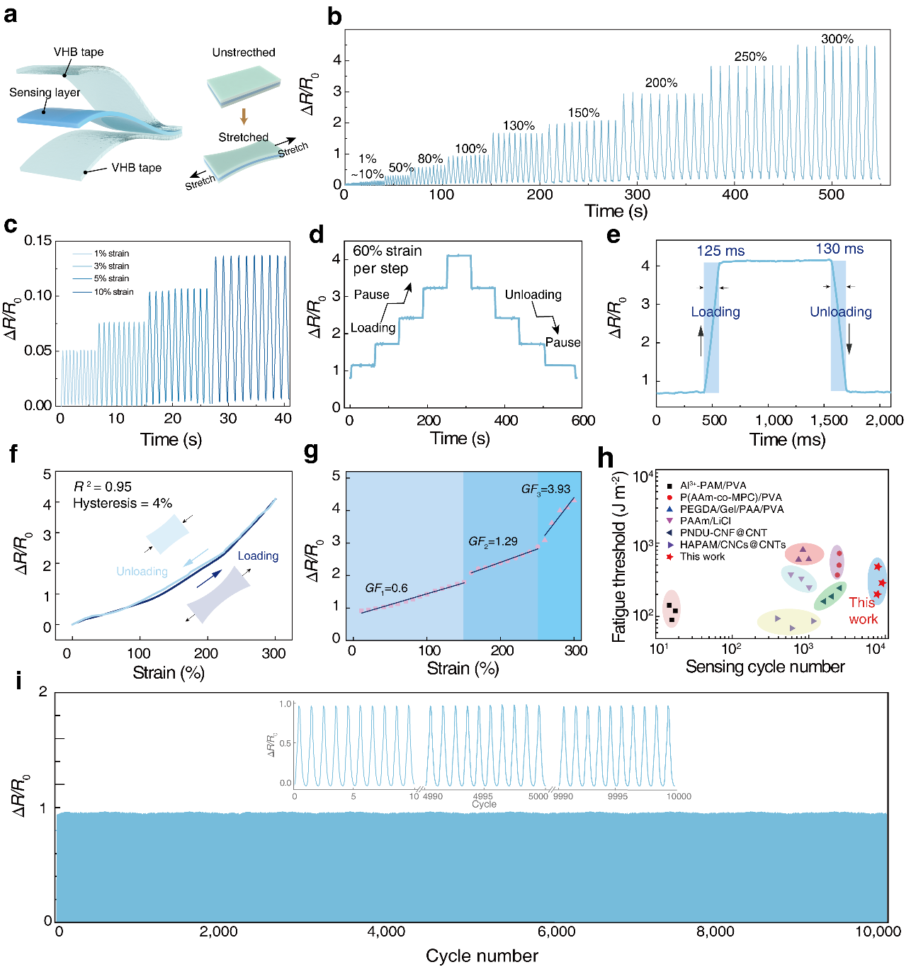 DFS PEDOT:PSS-PVA水凝胶制备的应变传感器在微小变形(1%-10%)和大变形(10%-300%)内均表现出明显的电阻变化;同时,在0%-300%应变范围内逐步加载和卸载过程中的响应时间为130 ms,无明显迟滞现象。DFS PEDOT:PSS-PVA水凝胶应变传感器的灵敏度(GF)在0%-150%应变范围内为0.6、150%-250%应变范围为1.29、250%-300应变范围为3.93。10,000圈应变传感测试中,DFS PEDOT:PSS-PVA水凝胶应变传感器依旧维持稳定,显著优于前期已报道的各类水凝胶应变传感器(图3)。