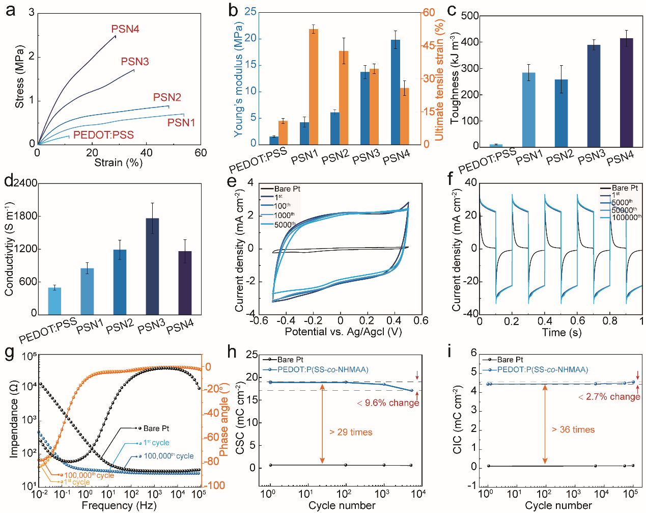 PSN水凝胶具有优异的力学与电学性能,在力学性能上相比于同条件下制备的纯PEDOT:PSS水凝胶,PSN水凝胶最大拉伸性提升4倍可达到53%;最大韧性提升了近40倍达到了414 kJ m-3。在电学性能上,PSN水凝胶最高电导率> 1800 S/m,可达同条件下自制纯PEDOT:PSS水凝胶的3倍,比传统半互穿结构增韧的PEDOT:PSS水凝胶高出两个数量级,且电化学稳定性优异,在5000次充放电循环测试和100000次双向注入脉冲刺激后仍然保持远低于Pt电极的界面阻抗和高电荷储存容量与注入性能(图2),能够满足生物电子界面的性能需求。