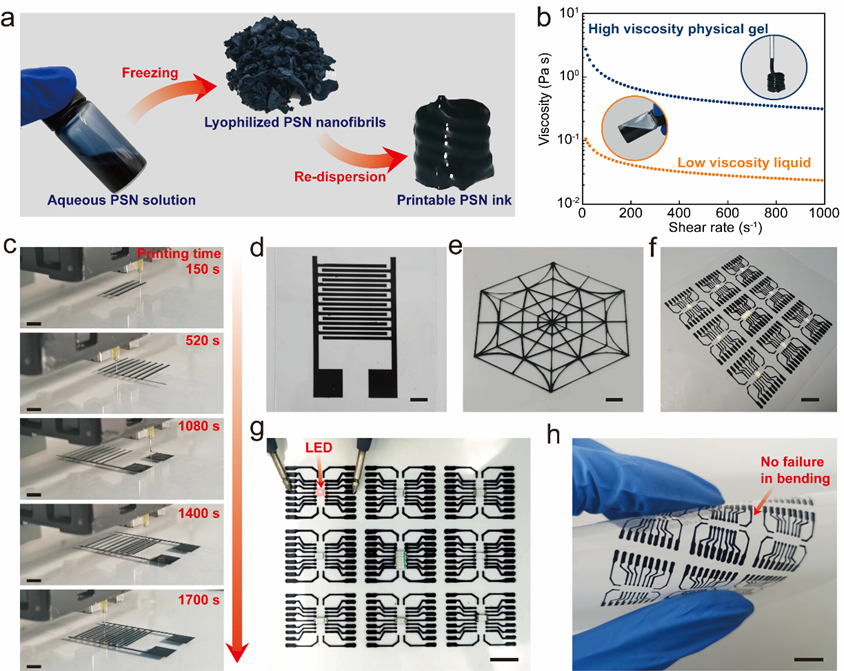 团队通过冻干再分散的方式有效调控PSN水分散液的粘度,进而制备了满足3D打印性能的PSN墨水。这种墨水具有卓越的3D打印性和可编程性,可以通过DIW 3D打印技术便捷地制造出各种高分辨率的二维图案(例如叉指电极、网状结构和多电极阵列)和悬挂式三维结构。打印的电极阵列显示出优异的电学性能,可运行发光二极管(LED)等电气元件。此外,PSN水凝胶中P(SS-co-NHMAA)的羟基和醚键能有效增强与PET、聚酰亚胺、纸张等各种基材的界面粘附力,使其在弯曲和扭曲等各种力学形变情况下都能牢固贴合,而不会出现任何显著分层现象(图3、视频1)。这种优异的3D打印性和可编程性,结合其出色的电学和力学性能,有望使PSN水凝胶应用于各种前沿领域(例如可拉伸电子、柔性生物电子)。