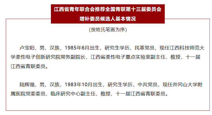 8月25日至26日,中华全国青年联合会(简称“全国青联”)十三届三次常委会扩大会议召开。会议审议通过了关于增补全国青联第十三届委员会常务委员会委员的提议,以及全国青联第十三届委员会增补委员名单,通报了全国青联第十三届委员会提案和建议工作委员会设置方案,以及2021—2022年度履职优秀委员等相关情况。根据《关于做好全国青联第十三届委员会2023年委员增补工作的通知》要求,江西省青年联合会经充分酝酿协商,拟提名江西科技师范大学卢宝阳教授为全国青联第十三届委员会增补委员候选人。