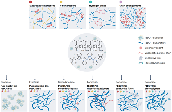 PEDOT:PSS基前驱体墨水需要合理设计以满足3D打印结构的需求。典型的设计策略包括分子工程(例如分子结构设计和链-链相互作用)、跨尺度相工程(从纳米、微米到毫米尺度)以及形态调控。这些策略借助多种分子、多个相区之间的相互作用重新设计组分并成功指导制备了多种墨水系统,包括纯PEDOT:PSS墨水以及PEDOT:PSS分别与二次掺杂剂、粘弹性聚合物、导电填料和光敏聚合物的复合墨水。在本节中,我们简要总结了各种可3D打印的PEDOT:PSS基墨水(图2),并讨论了相应的设计原则及内部机理。