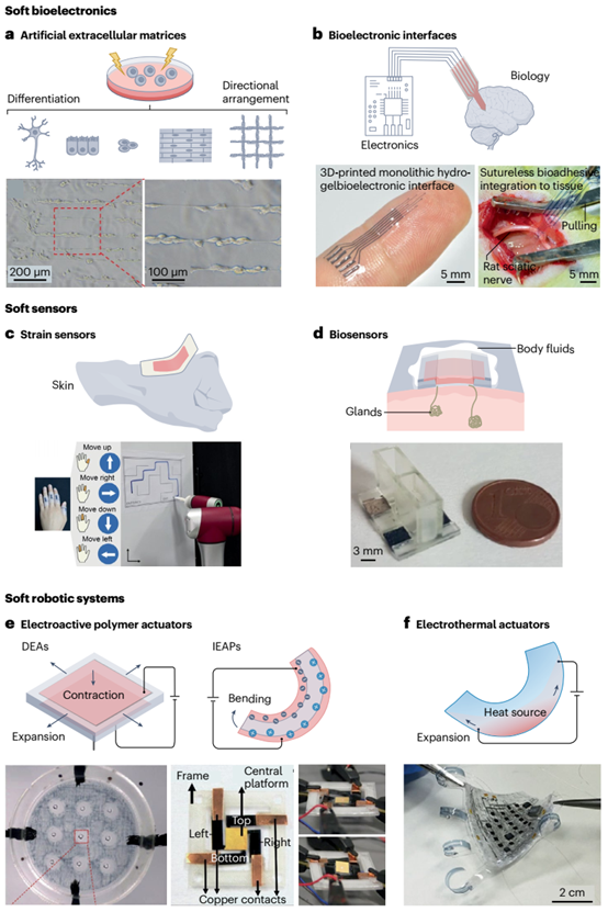 3D打印PEDOT:PSS技术为软体机器人系统定制具有生物兼容性和刺激响应性的导电复合结构。在本节中,我们总结了其在以生物电子、软体传感器及作动器为代表的软体机器人系统中应用的关键问题、发展现状及技术优势(图5)。