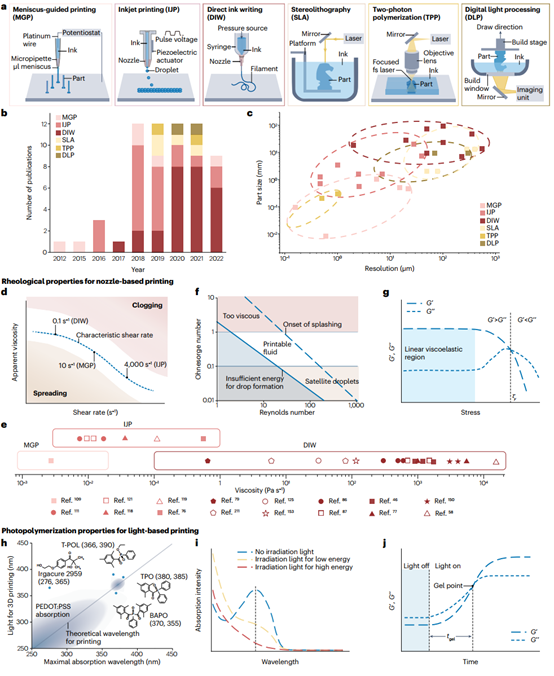3D打印作为一种低成本和可扩展的数字增材制造技术,根据不同成型机理可以细分为基于针头引导的打印和基于光聚合的打印。在本节中,我们提出了墨水可打印性的评估指南,聚焦流变学和光聚合性质,以表征、评估和比较不同墨水组分,加速墨水组分的设计迭代和打印技术的改进优化(图3)。同时,我们回顾并分析了不同打印方法包括弯月面引导打印(MGP)、喷墨打印(IJP)、墨水直写(DIW)、立体光刻(SLA)、双光子聚合(TPP)以及数字光处理(DLP)的原理特点、技术演变及发展潜力(图4)。