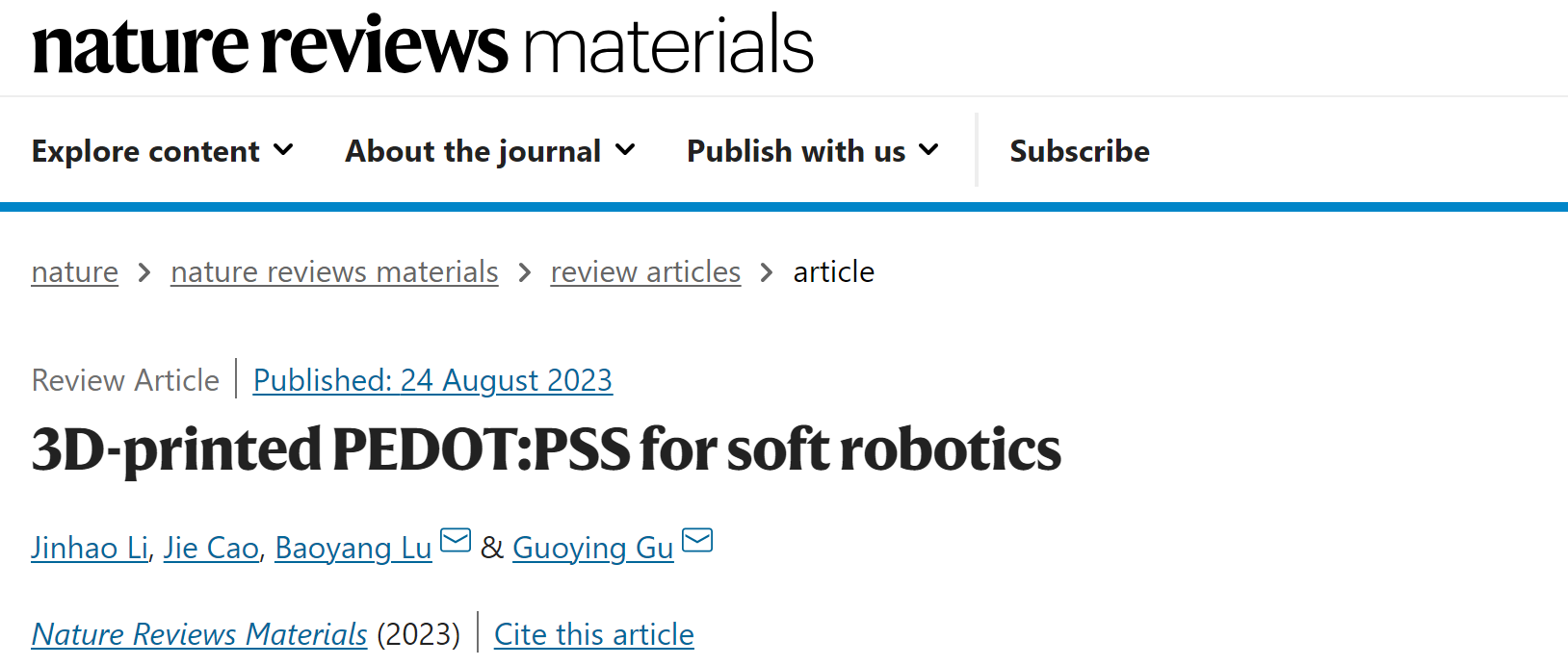 J. Li, J. Cao, B. Lu, G. Gu, ”3D-printed PEDOT:PSS for soft robotics”, Nature Reviews Materials, 2023.