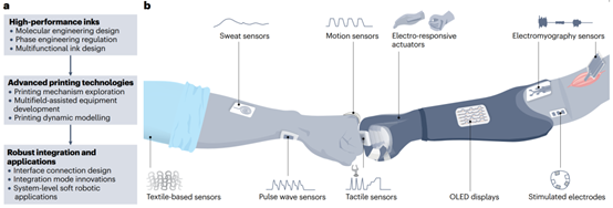 3D打印PEDOT:PSS在面向人机交互的软体机器人中展现出独特优势,其中机遇和挑战并存。高性能PEDOT:PSS材料促进了制造原理开发及机器人自主功能集成,3D打印则为PEDOT:PSS基材料提供了自由设计空间和任务导向的结构制造能力。该技术将从原理、器件和系统等多个层面推动软体机器人的技术进步与应用发展。在本节中,我们从高性能墨水设计、先进制造技术和系统集成三个方面对未来方向及前瞻应用进行了讨论与展望。