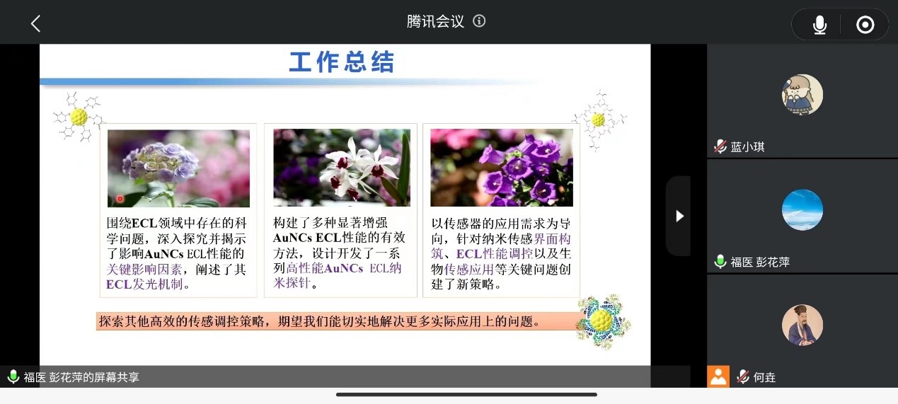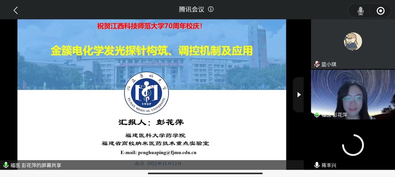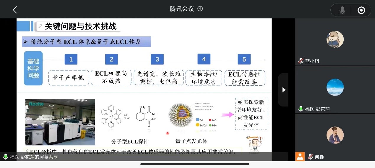 2022年11月13日晚上,福建医科大学彭花萍教授以《金簇电化学发光探针构筑、调控机理及应用》为题为小白象全体师生举行了腾讯会议线上学术讲座。