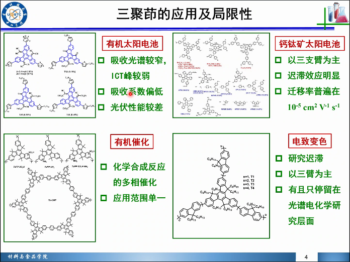 之后,讲述了三聚茚的应用与局限性,并且三聚茚具有优良的荧光性能、热稳定性能和空穴传输性能,是应用广泛的有机光电材料。