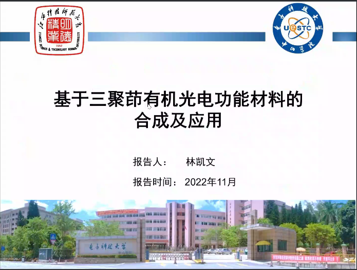 2022年11月12日晚上,电子科技大学中山学院林凯文副教授以《基于三聚茚有机光电功能材料的合成及应用》为题为小白象全体师生举行了腾讯会议线上学术讲座。