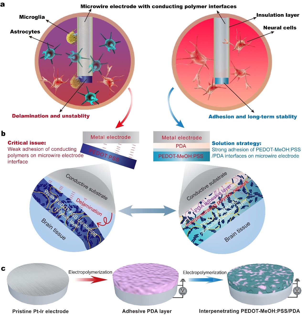 能够实现长期稳定应用的粘性导电神经电极界面对生物医学甚至临床应用至关重要。然而,电沉积的纯PEDOT:PSS神经接口普遍不稳定,表现为接口的分层和开裂,严重阻碍了其快速创新和实际应用(图1a)[16,21,26]。为了克服这一障碍,我们以前的工作报告了一个简单而有效的策略,即引入一个可加工的亲水聚氨酯的中间粘合剂纳米层。虽然这种方法可以大大增强导电聚合物在潮湿的生理环境中的界面粘附力,但它仍然无法实现轻松的微细加工和集成到多通道的超小线微电极,以及长期的可靠性和稳定性,足以满足神经研究的要求。