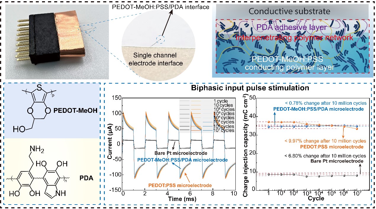 Tian F, Yu J, Wang W, et al. Design of adhesive conducting PEDOT-MeOH: PSS/PDA neural interface via electropolymerization for ultrasmall implantable neural microelectrodes[J]. Journal of Colloid and Interface Science, 2023, 638: 339-348.