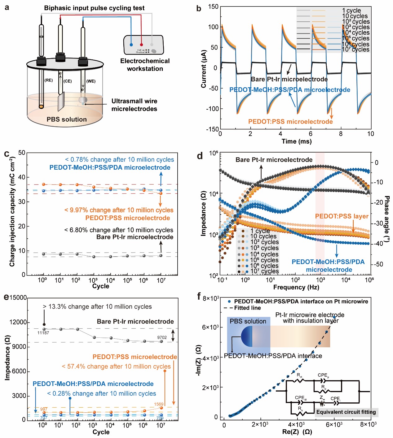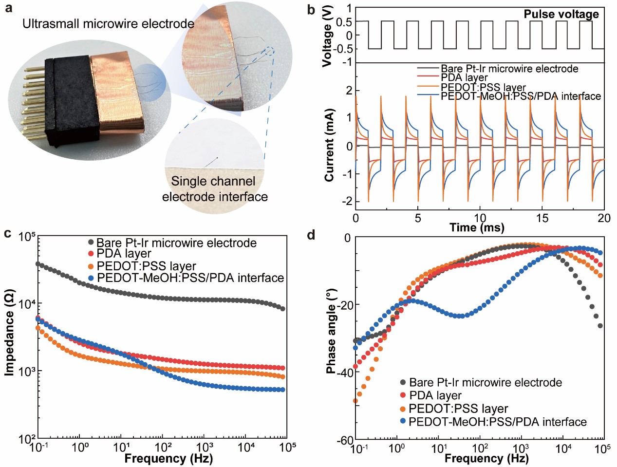 图4. 不同聚合物界面(即PDA、PEDOT-MeOH:PSS和PEDOT-MeOH:PSS/PDA)在超小Pt-Ir线微电极上的电化学特性。