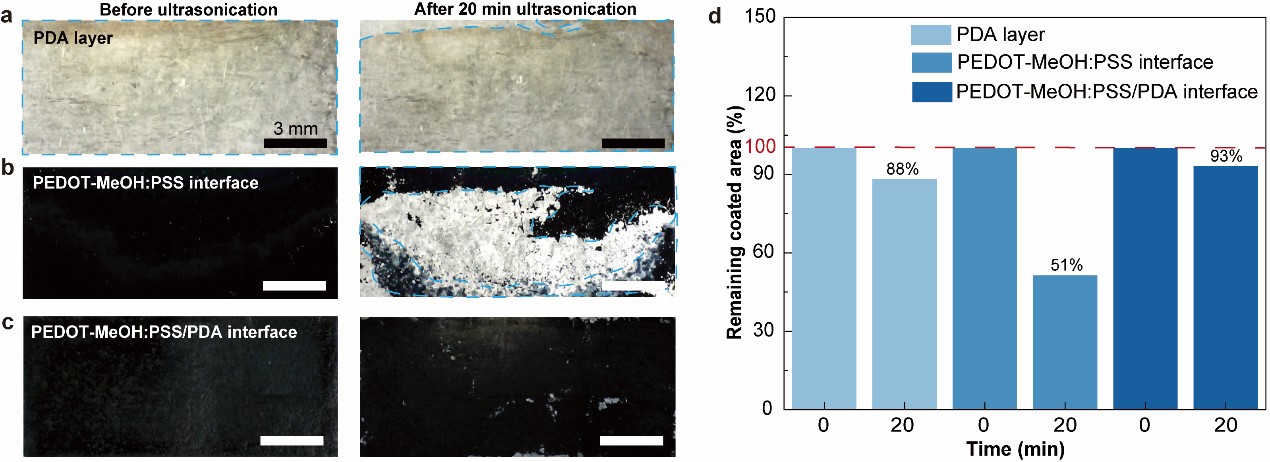 为了理解PEDOT-MeOH:PSS/PDA界面的形成(图2a),作者根据电化学聚合过程,第一个氧化步骤是儿茶酚氧化为醌(O1),然后发生环化,最后由亮多巴胺铬到多巴胺铬(O2),实现电化学氧化聚合获得了高度交联的PDA薄膜(图2b)。此外,EDOT-MeOH单体通过阳极氧化被触发形成阳离子自由基,两个阳离子自由基在去质子化后被耦合形成二聚体。然后二聚体被重新氧化并与另一个阳离子自由基耦合,实现链生长和聚合物薄膜的沉积(图2c)。由于PDA和PEDOT-MeOH:PSS具有丰富的羟基官能团,在二次电沉积过程中可以通过分子间/跨分子氢键形成相互渗透的聚合物网络,在二次电沉积过程中有可能有效地增强界面粘附力和凝聚力(图2d)。