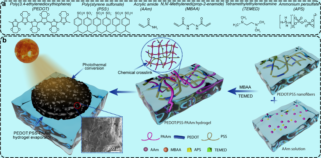图1. 用于太阳能水蒸发的PEDOT:PSS-PAAm水凝胶的设计。