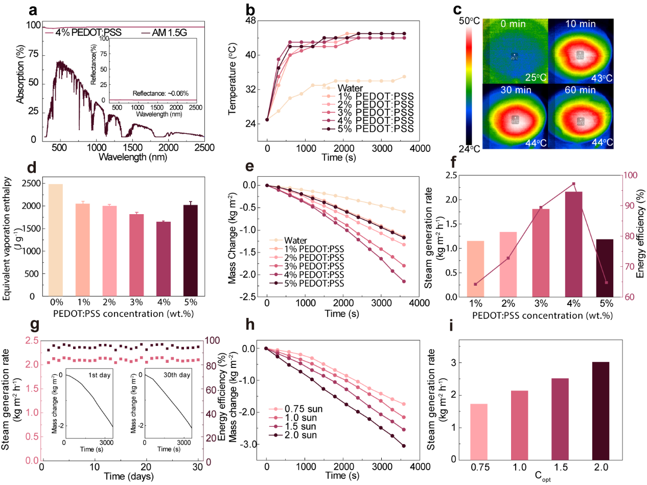 图3. 不同 PEDOT:PSS-PAAm 双网络水凝胶的太阳能蒸汽发生性能。