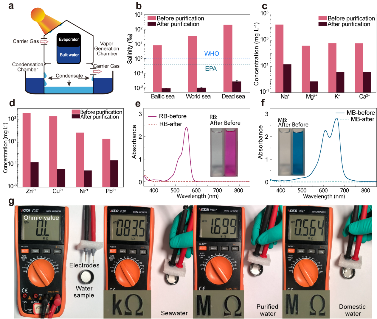 我们所获得的PEDOT:PSS-PAAm双网络水凝胶具有独特的优势蒸发性能组合,包括出色的阳光吸收率 (~99.8%)、快速蒸发速率 (2.15 kg m-2 h-1) 和高的能量效率 (~97.2 %)。PEDOT:PSS-PAAm 双网络水凝胶还被证明在真正的水净化应用具有出色的长期稳定性,在模拟海水淡化的30天连续测试中显示出94.8%的平均能量效率(图3)。