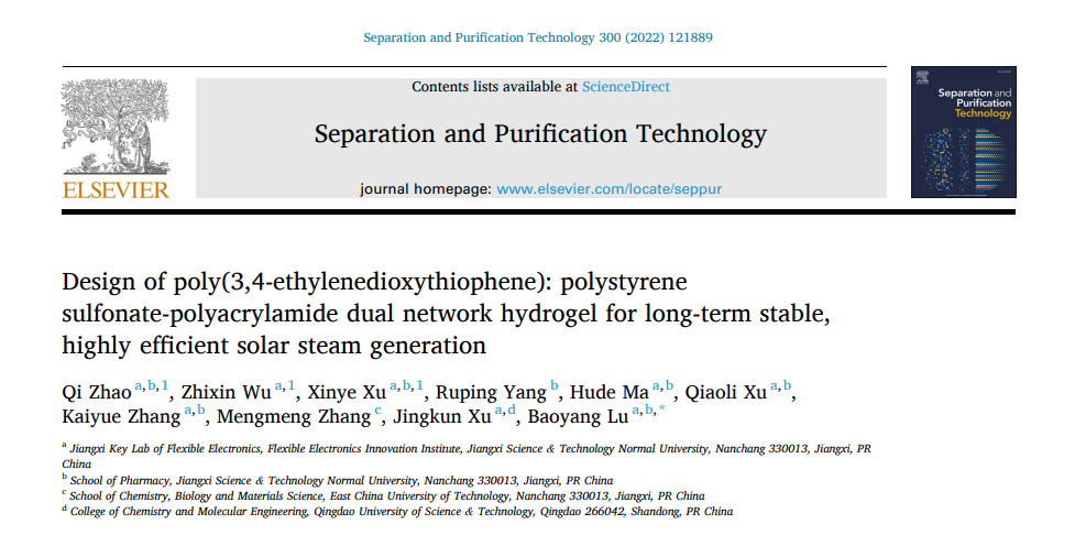 近日,课题组在国际高水平期刊《Separation and Purification Technology》(IF=9.136, JCR: Q1区,中科院1区Top)在线发表题为“Design of poly(3,4-ethylenedioxythiophene):polystyrene sulfonate-polyacrylamide dual network hydrogel for long-term stable, highly efficient solar steam generation”的研究论文,课题组2019级分析化学专业硕士生赵奇同学为第一作者,2019级高分子化学与物理专业吴之心同学和2021级分析化学专业徐新叶同学为共同第一作者,卢宝阳教授为该论文的通讯作者。