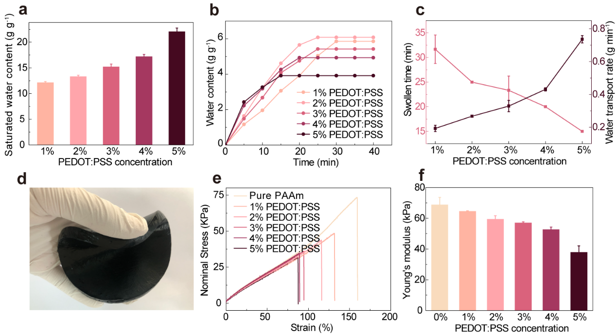 图2. PEDOT:PSS-PAAm双网络水凝胶的含水量、溶胀行为和机械性能。