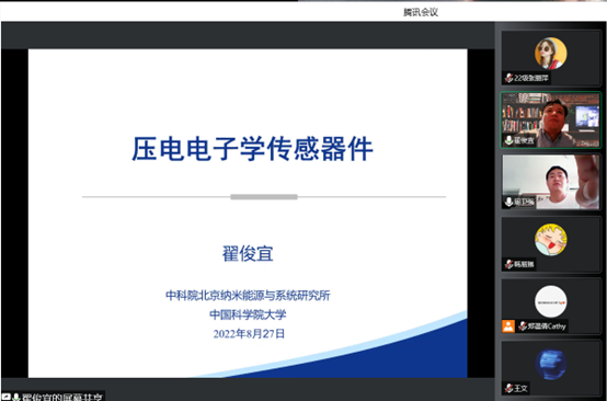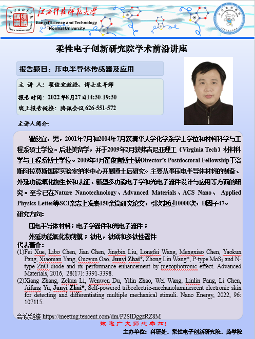 2022年8月27日下午,中科院北京纳米能源与系统研究所翟俊宜教授在腾讯会议举行了以《压电半导体传感器及应用》为题的学术前沿讲座。翟俊宜教授于2001年7月和2004年7月获清华大学化学系学士学位和材料科学与工程系硕士学位。后赴美留学,并于2009年月获吉尼亚理工(Virginia Tech)材料科学与工程系博士学位。2009年4月翟俊宜博士获Director's Postdoctoral Fellowship于洛斯阿拉莫斯国家实验室纳米中心开展博士后研究。主要从事压电半导体样的制备、外延功能氧化物生长和表征、新型多功能电子学和光电子器件设计与应用等方面的研究。至今已在Nature Nanotechnology 、Advanced Materials 、ACS Nano、Applied Physics Letter等SCI杂志上发表150余篇研究论文,引次超过10000次,H因子47。